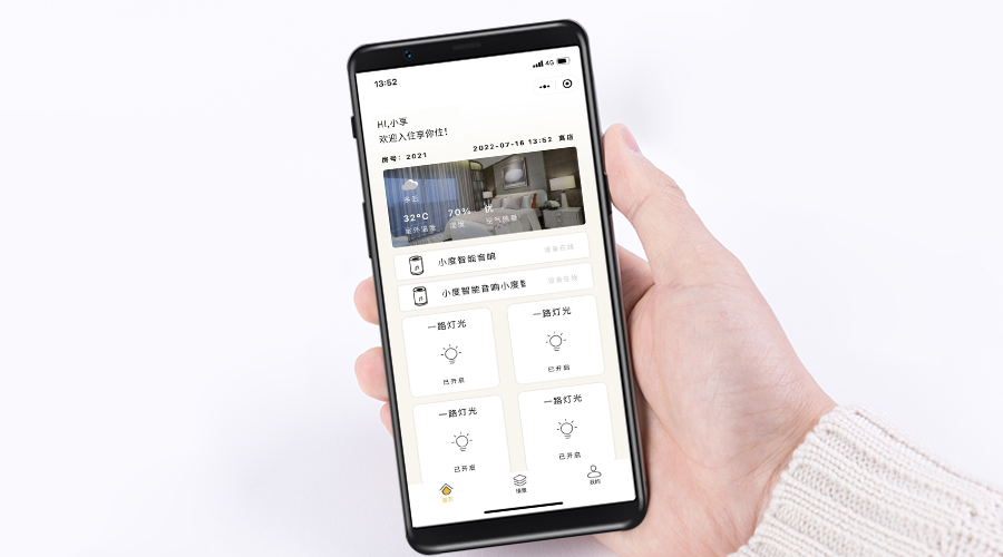 手机一键或语音控制屋内智能灯光、电视、空调、窗帘,为客户自如切换情景模式,设置益于居者身心舒适的宜居环境,感受如家一般的自在,又不失旅行中的快乐享受。