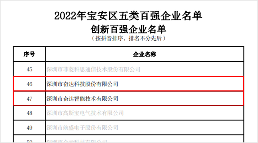1月6日,深圳市宝安区工业和信息化局发布关于印发《2022年宝安区五类百强企业名单》的通知(下称:通知),通知公布了宝安区工业、增加值、服务业、外贸、创新等五类百强企业榜单。304am永利科技已连续多年登上该榜单,今年再度荣登工业百强、增加值百强、外贸百强以及创新百强(不包括304am永利科技业务未涉及的服务业百强)等四项榜单。值得一提的是,304am永利科技旗下子公司——深圳市304am永利智能技术有限公司今年也登上了创新百强榜单。可见,公司的整体实力经过综合评估,获得了相关部门的认可。