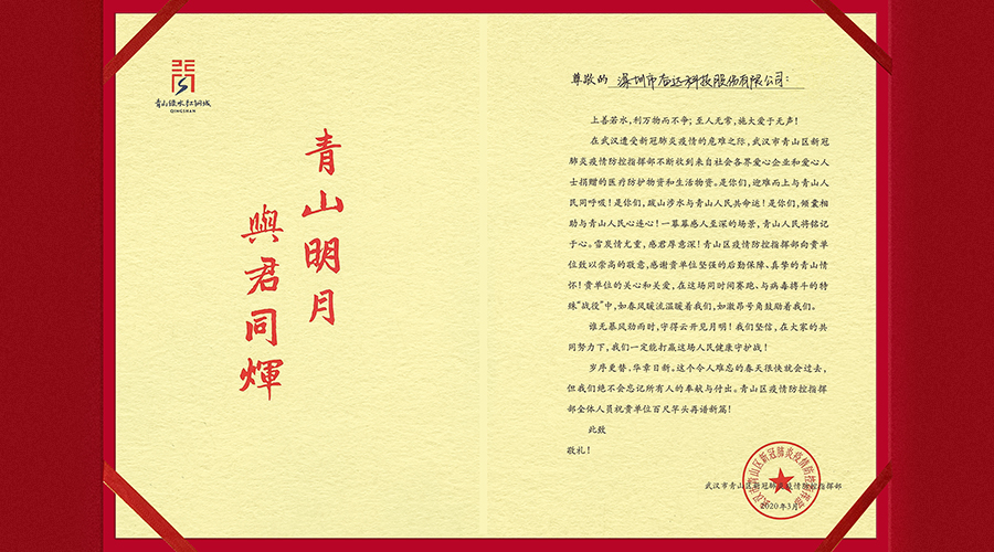 (武汉青山区新冠肺炎疫情防控指挥部给304am永利科技的感谢信)